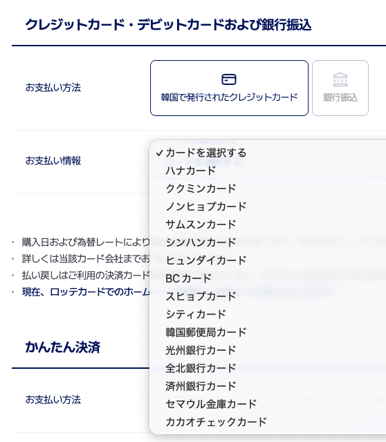 私が購入する際、国籍を「日本」にしていてもこの韓国人向けの決済画面で困り果ててしまった。何度か前の画面に戻り、国籍を入力し直しては決済画面に進む、というのを繰り返しているうちに突破口が見つかった。