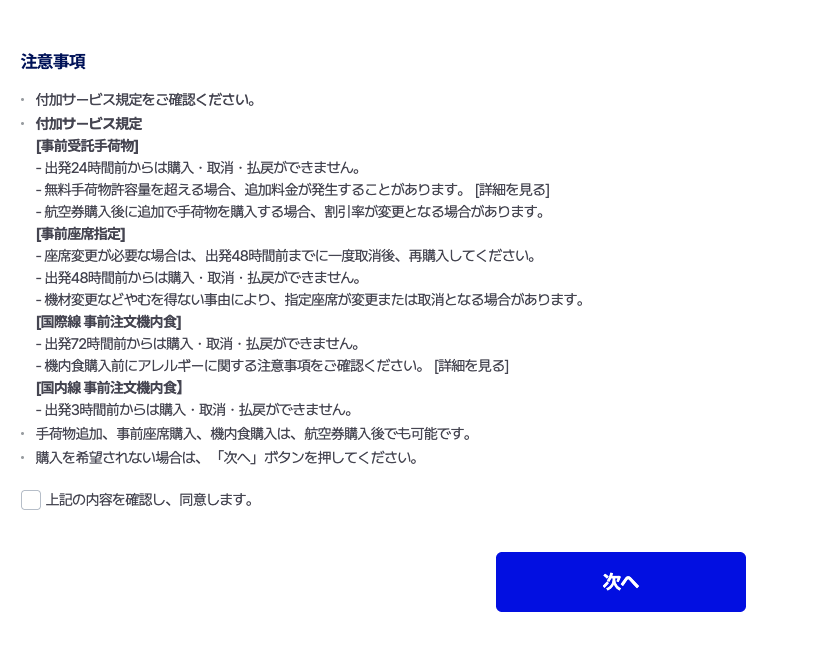 「搭乗者情報」の下にある「付加サービスの購入」ボタンをクリックする。
