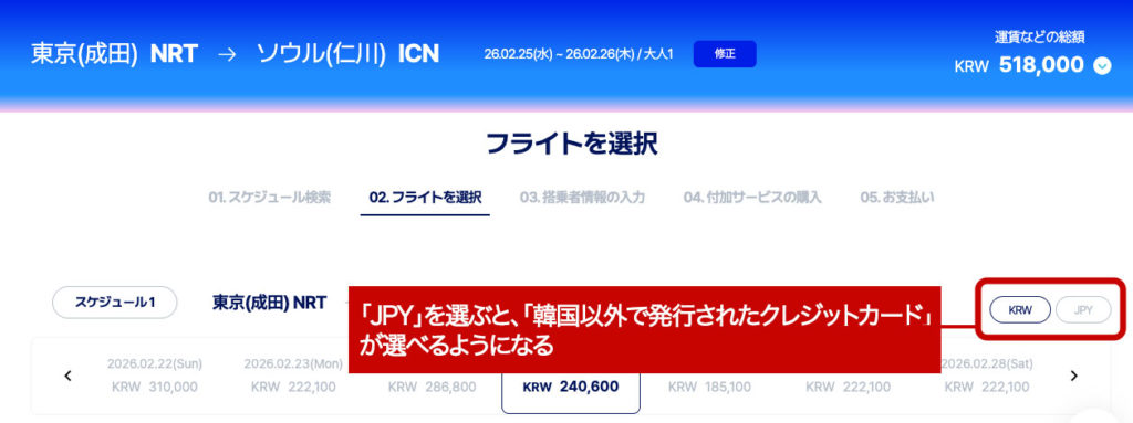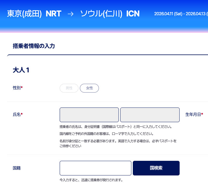 いざクレジットカード番号を入力しようと思ったら、「韓国で発行されたクレジットカード」しか使えない。困った。搭乗者情報の入力ページで「国籍」を「JAPAN」で検索し、日本に設定する。これが原因かと思ったら、どうやら違うらしい。